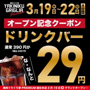 オープン記念セールとしてソフトドリンクバーを29円(税込32円)でご提供