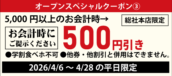 オープン記念クーポン③:お会計5000円以上で500円引き(4/6~4/28の平日限定)
