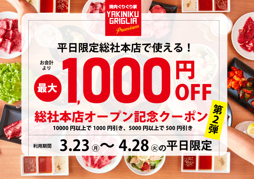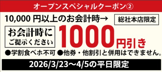 オープン記念クーポン②:お会計1万円以上で1000円引き(3/23~4/3の平日限定)