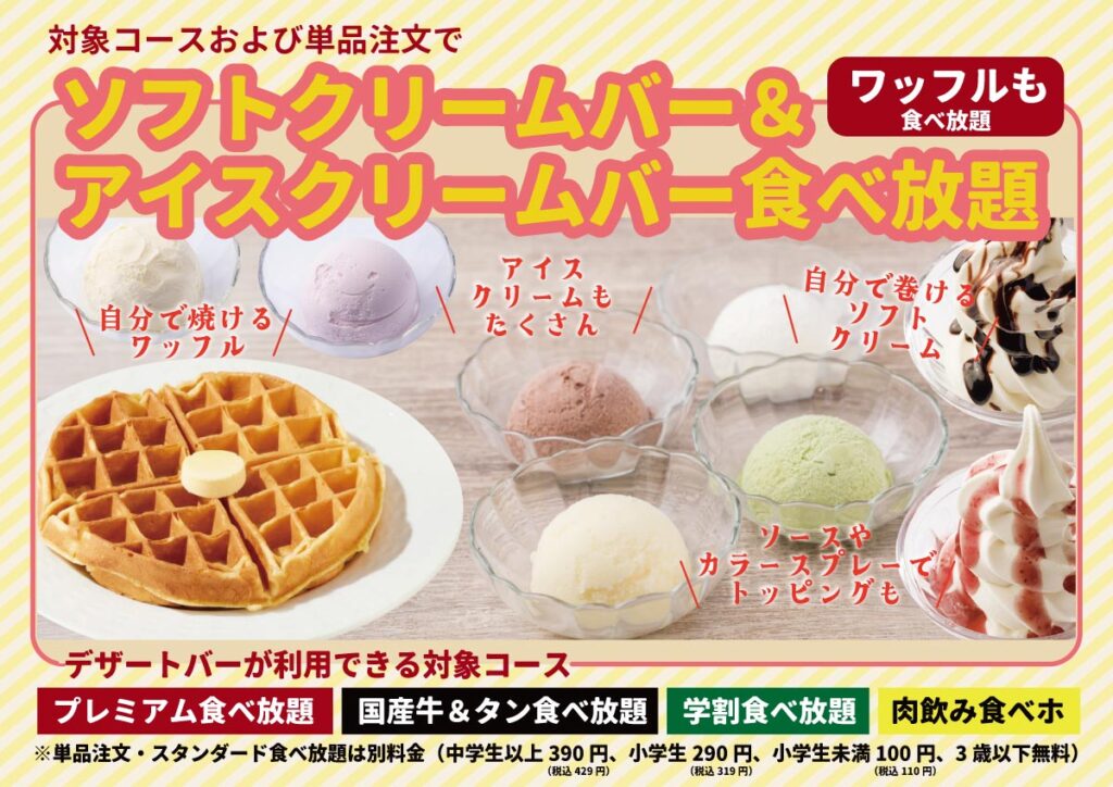 PREMIUM店舗限定の『自分で焼けるワッフル』やトッピング自由の『ソフトクリーム』や常時6種の『アイスクリームバー』をご用意。食べ放題では『学割食べホ』、『肉飲み食べ飲みホ』、『プレミアム食べ放題コース』、『国産牛&熟成タン食べ放題コース』の4コースはデザートバーが食べ放題に含まれます。